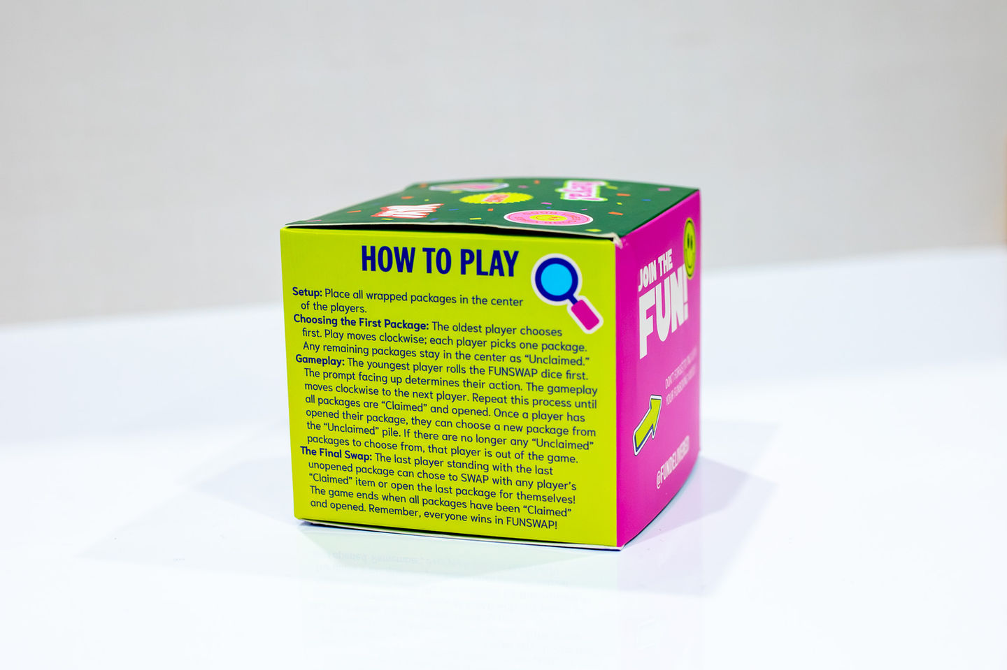 Our FunSwap gift exchange game is our chaotic, can’t-stop-laughing party game built for mystery package lovers and chaos coordinators alike. It's addictive, east to play and guaranteed to turn any room into pure fun. Roll the 12-sided die, swap, steal, and unbox your way through the mystery. Perfect for families, friend groups, holidays, and anyone who believes surprises are better shared. Now available as an optional add on for our Party Box!