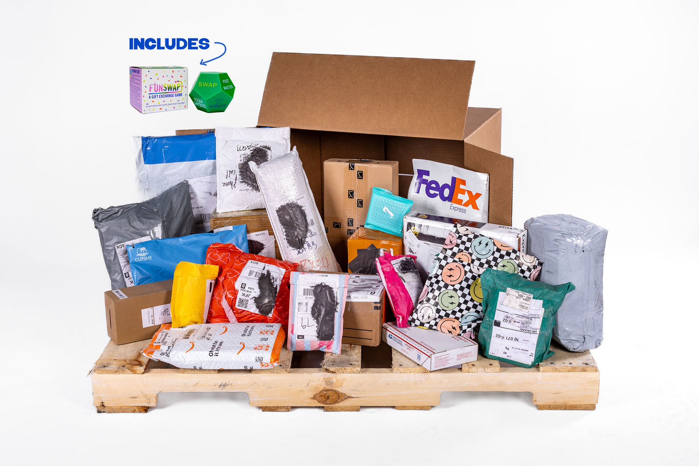 - FunSwap Party Box : a mix of 22-25 packages in a variety of sizes + The FunSwap game